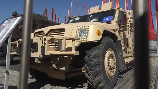 Бронетранспортерлордун арасында Украинага белекке берилген Британ армиясынын тактикалык колдоо машинасы бар. Анын алдыңкы айнеги ок менен калбырланган.