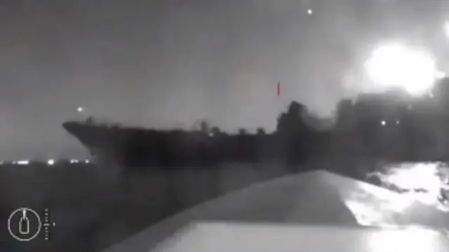 اما مقامهای اوکراینی ویدئویی در اختیار بیبیسی گذاشتهاند که به نظر میرسد با دوربین شهپاد گرفته شده و نشان میدهند که شناور به نزدیکی یک ناو میرسد.