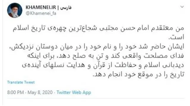 انتشار توییتی از آیت الله علی خامنه ای درباره صلح امام حسن که به تعبیر رهبر ایران "خود را فدای مصلحت واقعی کرد" باعث گمانهزنیهای گسترده از جمله در میان کاربران شبکه های اجتماعی شده است.