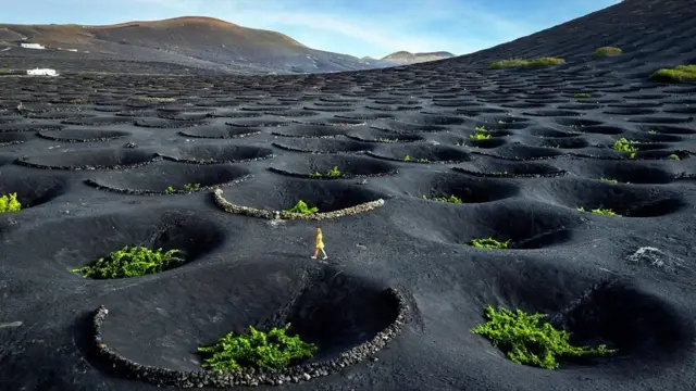 Якщо дивитися здалеку, то виноградники Лансароте мають мало ознак життя. Величезні площі чорної землі всіяні конічними западинами, схожими на відбитки пальців міфічного велетня. Але якщо ви підійдете ближче, то в серці кожного кратера побачите виноградну лозу.