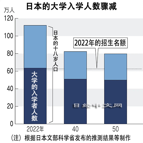 据相关人士介绍,日本大学的推测入学人数是根据日本国立社会保障与人口问题研究所推测的未来18岁人口乘以升学率,再加上外国留学生等的人数求出的。2022年,日本国内大学的实际入学人数为63万人,到2040年以后,这一数字将减少到49万~51万人,同比减少2成。