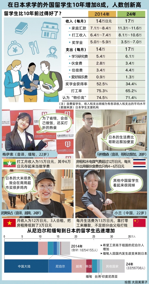 在日本求学的外国留学生不断增加。虽然曾因新冠疫情而一度减少,但由于日元贬值以及日本治安相对良好,以来自亚洲的留学生为中心,日本的留学生人数2024年刷新了历史最高纪录。10年里增长了8成。留学生在日本积极打工,在受长期人手短缺问题困扰的餐饮及零售业,他们已成为不可或缺的劳动力。日本经济新闻(中文版:日经中文网)记者探访了留学生在日本学习、工作、消费的真实情况。