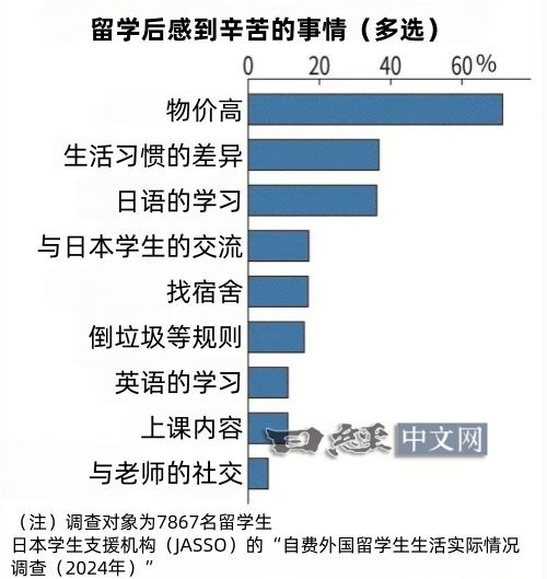 物价上涨直接影响着留学生的生活。日本学生支援机构于2024年10月公布的“自费外国留学生生活实际情况调查”显示,针对留学后遇到的困难,选择“物价高”的人占71.4%,比例最高。