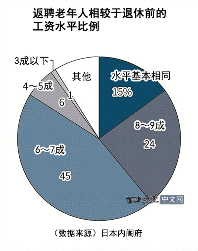 日本内阁府2024年实施的调查显示,退休返聘的工资水平与退休前“水平基本相同”的企业比例为15%,比5年前上升5.5个百分点。工资下降到退休前6成以下的企业占比不到1成。