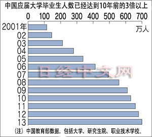 中国大学及研究生的应届毕业生人数今年达到了700万人,是10年前的3.3倍。每年将诞生相当于日本10倍的“大学毕业生”。只要拥有大学毕业证书就能找到工作的时代似乎已经一去不返。大连大学4年级学生小郑说,“与其在知名度低的大学上4年,不如到专业学校学习技术后就业,工资更高”。