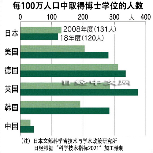 日本每100万人口中取得博士学位的人数远远低于美英德韩四国。关注度高的科学论文数量方面,日本在1990年代上半期排在世界第3,而2018年下滑到了第10……