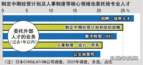 日本CIRCULATION公司2022年的调查数据显示,委托的业务内容中“招聘和培养人才”占27%(多选),其次“制定中期经营计划和组织战略”占25%。“人事制度·设计及劳务”占21%。经营策划和人事是企业活动的核心内容,专业人才这种“雇佣兵”也开始负责这一领域。