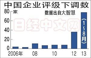 中国企业评级遭下调的情况正在急剧增加。2013年1~8月评级遭下调的企业达到78家,已经达到创历史新高的2012年全年的2倍以上。在产品供应严重过剩的钢铁、造纸和资源等行业,负债规模在膨胀……