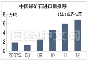 中国是稀有金属大国,但据业内推算,中国2012年锑矿石进口量为6万8580吨,比08年增3倍以上。原因是中国国内的高品位矿石减少,一家日本有色金属贸易公司指出,“中国可能打算保护国内资源”……