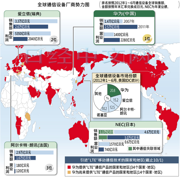 据美国调查公司IDC统计显示,从上半年通信设备全球市场占有率来看,华为占20.8%,居首位。尤其是在小型移动路由器等无线宽带终端领域,华为拥有55%的市场占有率。而在各国相继开始引进的高速通信服务“LTE”领域,在已完成实用化的约50个国家中,华为最少在34个国家进行了销售。