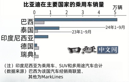 中国汽车大型企业比亚迪(BYD)正在增加纯电动汽车(EV)等的海外销量。今年1~9月,在巴西和东南亚市场的带动下,海外销量同比增至2倍,达到约30万辆。从欧洲来看,在德国转为减少,中国EV面临的逆风也在加强。正在迎来实现今后增长的关键时刻。