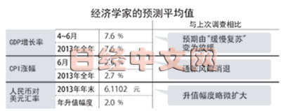2013年国内生产总值(GDP)实际增长率预期比2012年实际增速低0.2个百分点,而且低于国际货币基金组织(IMF)的预测(7.75%)。在上次调查中,20人认为增速将达到8%以上,而此次降至零。