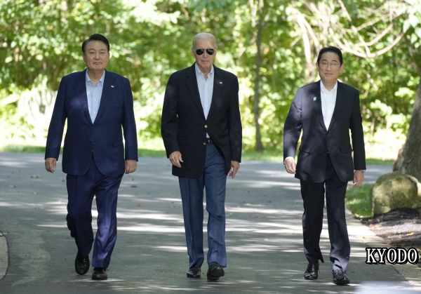 | 会谈结束后的日美韩三国首脑(2023年8月18日美国戴维营;图,KYODO) |