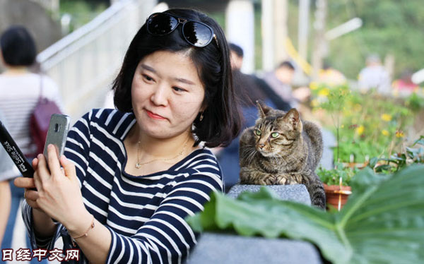 | 和猫咪一起拍纪念照的游客 |