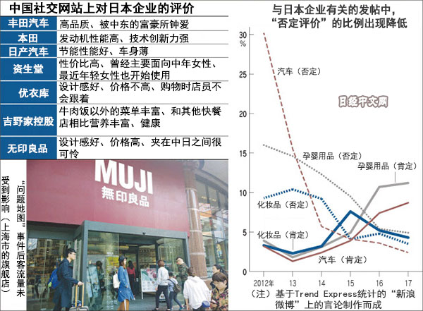 在中国,对日本企业的产品给予“安全性高”、“值得信赖”等评价的人出现增加,有数据显示批评日企产品存在缺陷、呼吁抵制日货的人呈减少倾向。