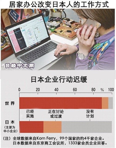 咨询公司Korn Ferry透露,在以99个国家的约4千家企业为对象的调查中,由于新型冠状病毒疫情扩大,采取居家办公的企业达到89%。但日本行动迟缓,难以注意到世界上正在发生从办公室、工厂、学校向家里的大规模人口移动。