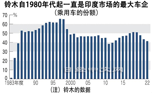 然而,印度汽车市场在2022年超过日本跃居世界第三。铃木自推进合资的第3年、即1985年以后,一直将当地子公司“玛鲁蒂铃木”的市场份额维持在4~6成,合并营业收入中印度所占的比例也在2022财年(截至2023年3月)提高至38.5%。在迎合印度的现实利益的同时,完美地将该国的经济增长纳入自身的增长中。