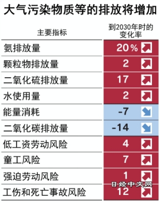 虽然二氧化碳的排放量将减少14%,但与大气污染相关的二氧化硫将增加17%,可吸入颗粒物PM10也将增加2%。人权相关方面,低工资劳动和童工等10个风险指标中,有7个出现恶化。