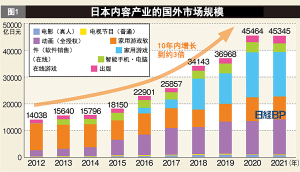并且,来自日本的内容在海外的推广正在年年扩大,2012~2021年10年时间,市场规模扩大到4.5万亿日元,达到原来约3倍(图1)。
