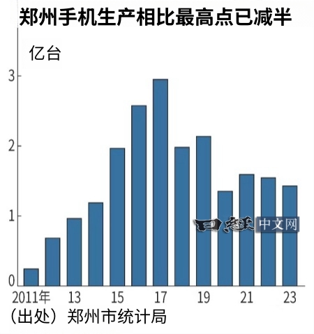 然而,根据郑州市统计局的数据,2023年郑州市手机生产量约为1.4亿部,相比2017年的高峰期减少了一半。受到地缘政治风险上升等因素的影响,美国苹果公司将部分iPhone的生产转移至印度等地。当地的富士康员工透露:“过去最忙的时候是三班倒,现在已经改为两班倒”。