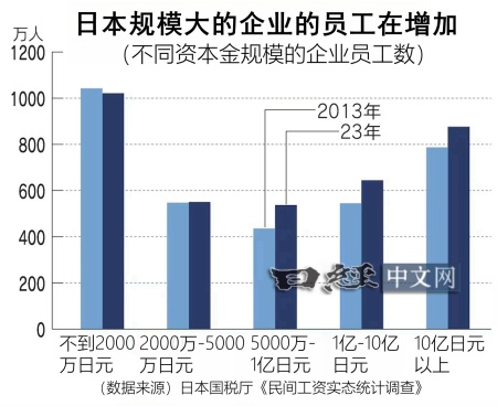 调查数据显示,不同规模的日本企业在员工数量增长方面也存在差异。将2023年的工资所得者人数与2013年相比,资本金10亿日元以上的企业(875万9651人)增长11.3%;资本金1亿至10亿日元的企业(644万1914人)增长18.3%;资本金5000万至1亿日元的企业(537万3472人)增长23.3%。