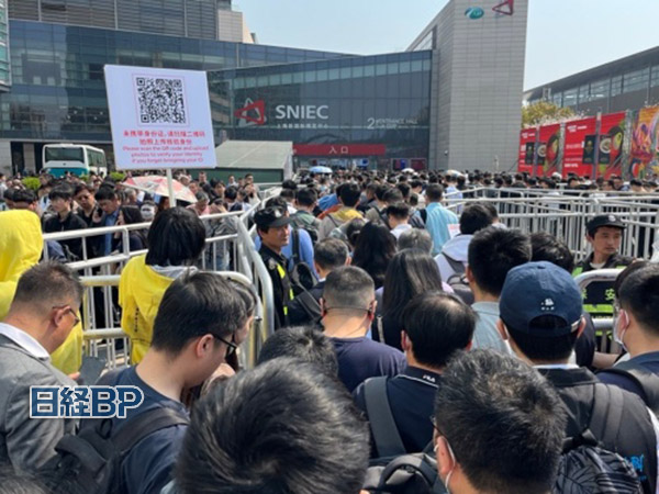| 展会首日的会场入口附近排起了长队(图片:日经XTECH) |