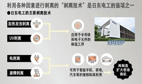 “剥离技术”原本就是日东电工的强项之一。该公司曾开发出通过加热或照射紫外线(UV)就能轻易剥离的胶带。这类胶带一直被应用于电子元件和半导体的制造工序。