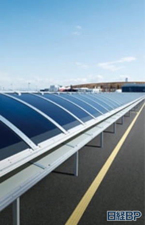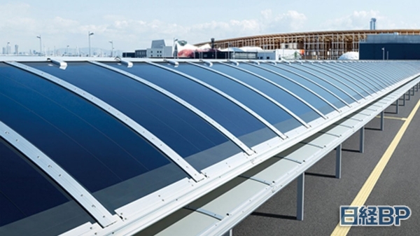 大阪关西世博会会场西门之前的交通枢纽——公交站的约250米屋顶上设置的薄膜型钙钛矿太阳能电池(图片:积水化学工业提供)
