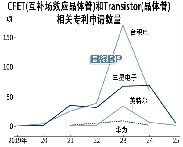 | 关键词包含“CFET”和“Transistor”的专利申请动向(数据来源:日经XTECH根据Patentfield的数据制图) |