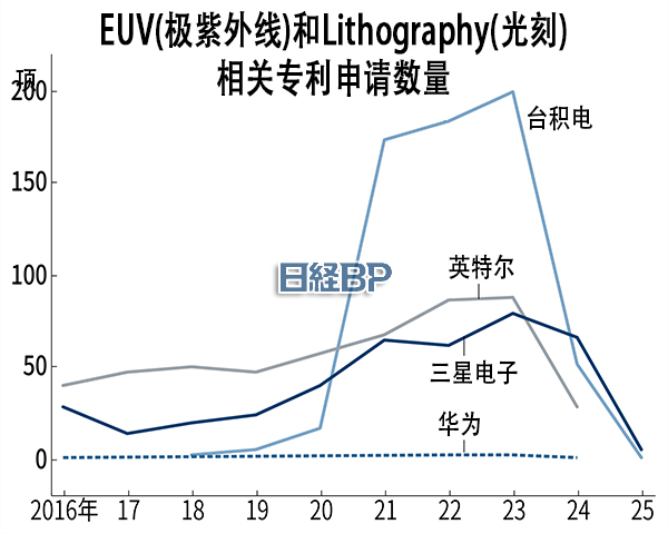 | 关键词包含“EUV”和“Lithography”的专利申请动向(数据来源:日经XTECH根据Patentfield的数据制图) |