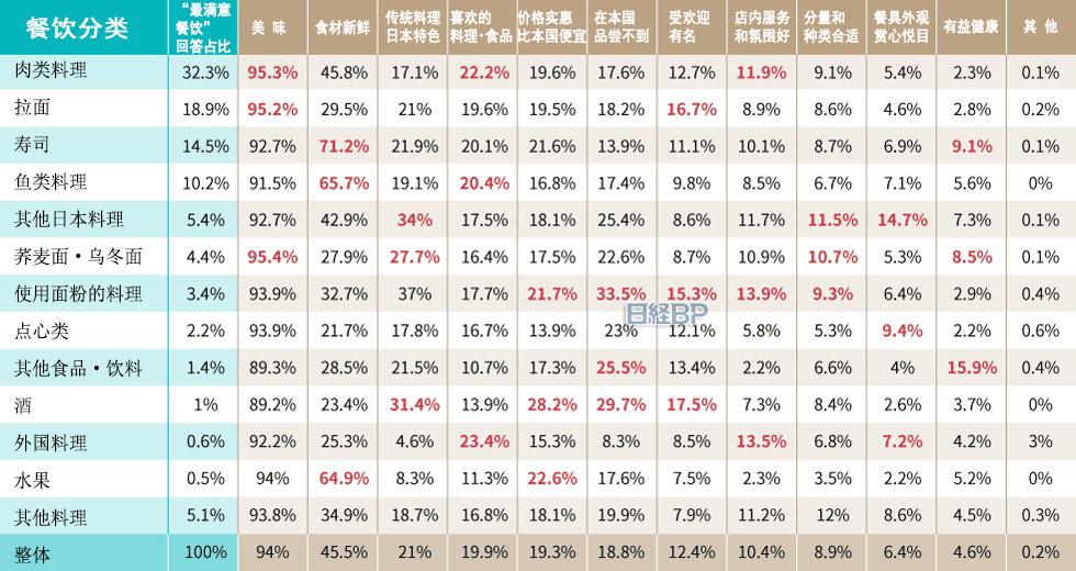 汇总1年内的4万5887份个人问卷后发现,回答数量最多的是“拉面・蘸面”,占比达到19.3%。其次是“寿司”和“烤肉”,分别占13.9%和 11.9%。不过,如果将排在第4的“品牌牛肉・和牛”也基本纳入烤肉的话,烤肉类实际上位居第2。另外,所有肉类料理都很受欢迎,如果再加上位居第10的“炸猪排”、排在第14位的“寿喜烧”、第15位的“牛排”、第16位的“烤鸡肉串”、第17位的“炸牛排”和第18位的“涮涮锅”,合计占比轻松超过20%。