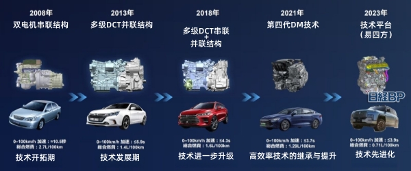 2008年,比亚迪全球首次量产串联式PHEV,2013年采用了搭载双离合变速箱(DCT)的并联技术。自2021年起,改为当前可称为“本田式”的模式。比亚迪的技术人员表示:“我们在不断追求效率的过程中发现,以电动行驶为主并且便于在所有速度区间提升效率的现行模式是最佳选择”。