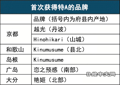 有6个品牌在此次评定中首次成为特A,全部来自日本西部。和歌山县的Kinumusume(县北)成为该县的首个特A。此前已成为特A的日本西部产地当中,很多地方“在全球变暖加剧情况下,着力栽培可以对应高温影响的品种”(日本谷物检定协会)。