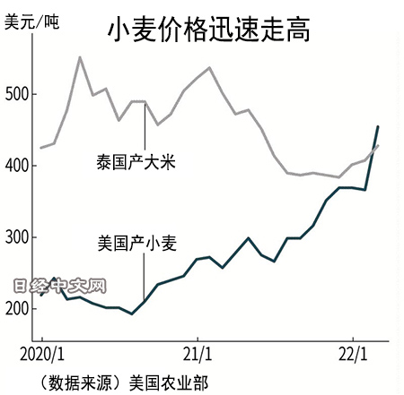 随着俄罗斯进攻乌克兰,两国出口量占世界3成的小麦的价格超过了大米。小麦全球年产量超过7亿吨,其中4分之1用于出口。由于乌克兰危机导致小麦价格上涨,替代需求转向大米,正在对各国的粮食采购产生影响。