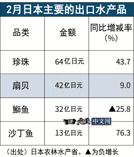 2月日本水产品的出口额为299亿日元。从珍珠来看,由于香港的国际展览会带来的需求,出口额增长4成。因中国禁运而受到打击的扇贝的出口额也达到42亿日元,转为增长9%。对中国的出口仍为零,但从2023年11月~2024年2月的累计出口额来看,对美国出口同比增至1.6倍,对泰国增至2.3倍,对越南增至4.1倍。