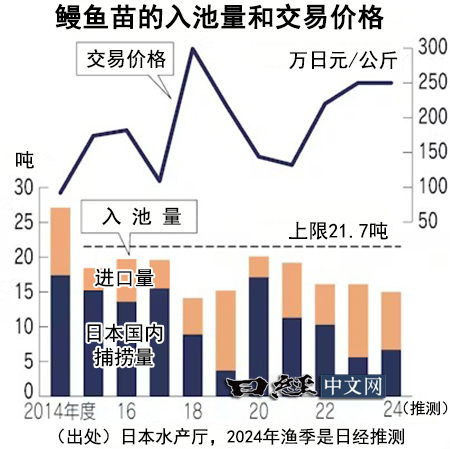 2024年渔季(2023年12月~2024年4月左右)在日本、中国大陆、台湾等捕捞的鳗鱼苗总量约为33吨。比上年渔季减少3成,处于2019年渔季以来的低位。