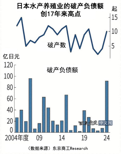 日本水产养殖业的破产正在增加。2024年度(截至2025年3月)日本全国的破产负债额达到91亿日元,是上年度的12倍。负债额超过雷曼危机及新冠疫情期间的水平,达到17年来的高点。占养殖成本8成的饲料费用高涨,给经营带来了压力。