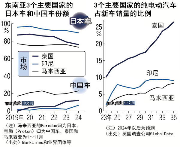另一方面,日本车的份额在印尼2024年比2019年全年减少6个百分点,降至89%,跌破9成。在泰国和马来西亚,2024年1~11月日本车的份额也分别下降11个百分点至76%、下降4个百分点至73%。