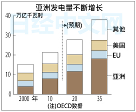 据经济合作与发展组织(OECD)统计显示,全球发电量到2035年将超过30万亿千瓦时,将比2008年增加8成。其中大部分新增发电量在以亚洲为中心的新兴经济体。太阳能和风力等可再生能源的发电成本很高,而且以目前的技术难以实现稳定发电。岩间教授认为“可以利用较少燃料实现大规模发电的核电站对新兴经济体来说非常有吸引力”。
