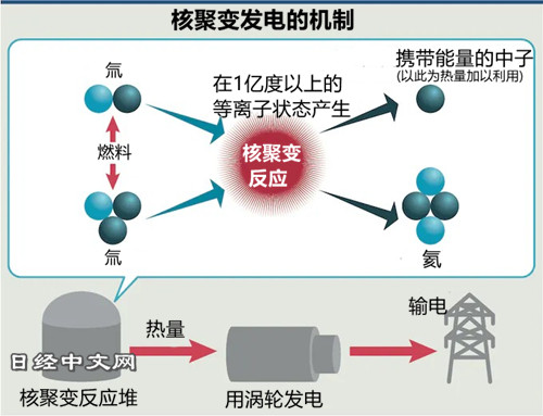 是类似氢的较轻原子核相互融合、形成氦等较重的原子核的反应,可以通过较少的燃料产生巨大的能量。在理论上,1克燃料可产生的热量与相当于一辆油罐车约8吨石油相同。达到目前核电站发生的核裂变反应的4倍。