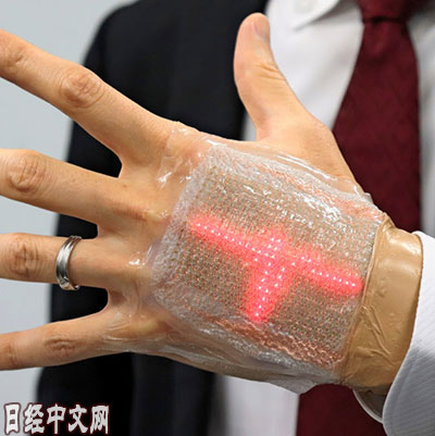 在试验中,研究人员使用医疗用粘合剂将显示屏贴在手上,放映出了心电图的波形和数字等简单视频。