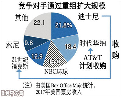 一方面,2017年握有约22%票房份额的华特迪士尼收购握有13%票房份额的21世纪福克斯,双方的合计份额超过30%。美国通信巨头AT&T也着手收购占据近20%票房份额的时代华纳。竞争对手不断扩张,投入雄厚的资金制作电影。