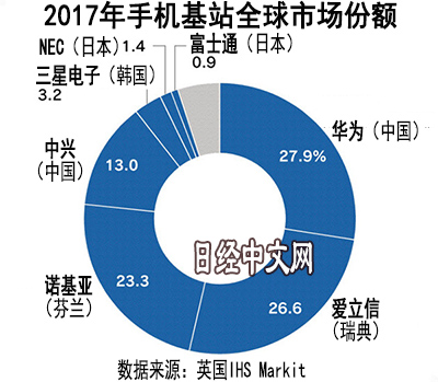 其中,最具势头的是中国企业。英国IHSMarkit的数据显示,在2017年的世界基站市场扩大份额的只有跃居首位的华为和排在第4位的中兴通讯(ZTE)这2家企业。与竞争对手相比,两家企业的成本被认为明显更加低廉。凭借这一成本竞争力的武器,两家企业不仅在新兴市场国家,还在发达国家不断扩大份额。