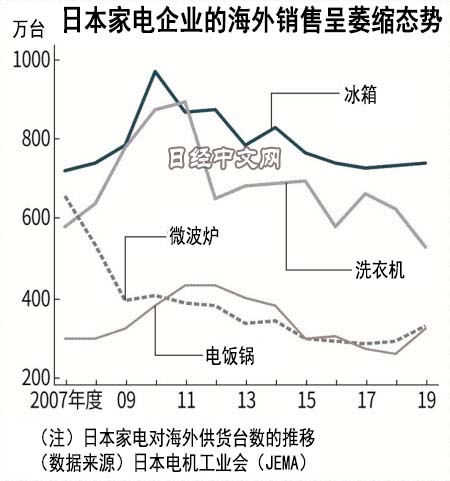 日本企业的洗衣机的海外供货量2011年度接近900万台,随后逐步减少,2019年度降至减少4成的527万台。冰箱的供货量也缩小至顶峰的4分之3。在小型家电领域,微波炉的海外供货量与2007年度相比减半。电饭锅也比2011年度减少约25%。