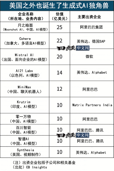 引领投资的是科技巨头。在过去一年成为独角兽的17家企业中,英伟达向Cohere等7家企业出资,谷歌的母公司Alphabet向涉足视频生成的Runway等4家企业出资。来自中国的5家AI独角兽企业均获得阿里巴巴集团投资。