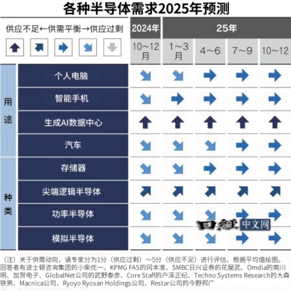 日本经济新闻关于2025年的半导体供需情况,邀请专家按照类型和用途分季度从供应过剩到供应不足5个等级进行了评估。回答来自调研公司、分析师及专业商社等11家机构。