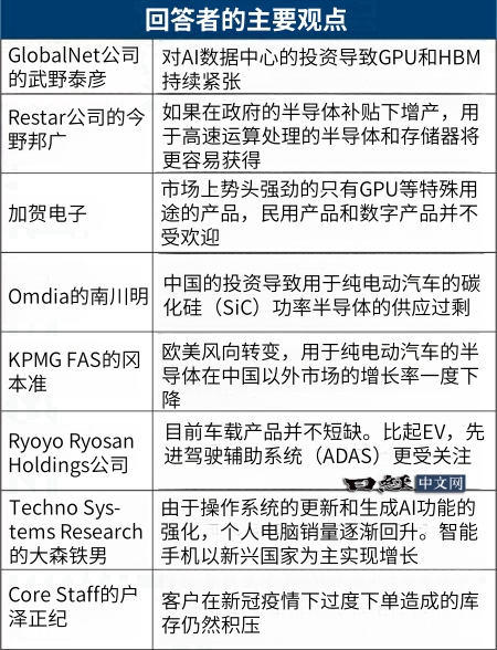 另一方面,汽车及工业设备等AI用途以外的半导体市场复苏缓慢。关于非尖端的运算用半导体和通用存储器的供需,专家们预计1月~3月供需将恶化,4月~6月以后将稳定下来。尽管有三家预测10月~12月供需会改善,但整体而言,给出了很谨慎的预测。