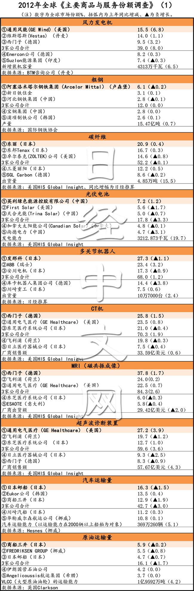 日本经济新闻(中文版:日经中文网)汇总了2012年全球“主要商品与服务份额调查”。日经中文网刊登所有50个品类的全球市场……