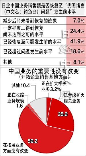 日本经济新闻社(中文版:日经中文网)汇总了“进驻中国的日本企业问卷调查”。在做出30%的企业的中国业务销售额仍未恢复到去年9月中日关系对立之前。感受到反日情绪的企业仍高达80%。但8成以上的企业表示将继续重视中国市场。