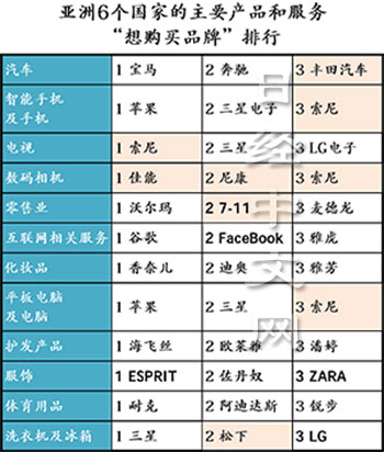 在亚洲6个主要国家对12类产品和服务的“想购买的品牌”进行了调查。最想购买的相机是佳能,最想买的车是德系车,最想买的电视是……